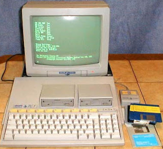 O meu primeiro computador foi uma máquina destas. Um PC1 da Olivetti. Tinha um rato como aquele que mostra na imagem, o que para a altura era uma inovação. Lembro-me perfeitamente do dia em que o vimos na loja em frente ao Video Clube Apache do Centro Comercial Babilónia na Amadora. Fomos buscar uma remessa de filmes para o fim de semana e lá estava a máquina. O meu pai olhou, olhou e para mim era algo fascinante. Já tinha visto a minha vizinha, que era professora, a escrever no seu Amstrad de ecrã amarelo... já tinha ouvido que havia uns computadores que tinham uns jogos brutais que eram os amigas, mas o meu pai queria era um computador destes. Precisava dele para o seu trabalho, dizia ele. Acabamos por levar os filmes para casa e nunca mais falamos disso.